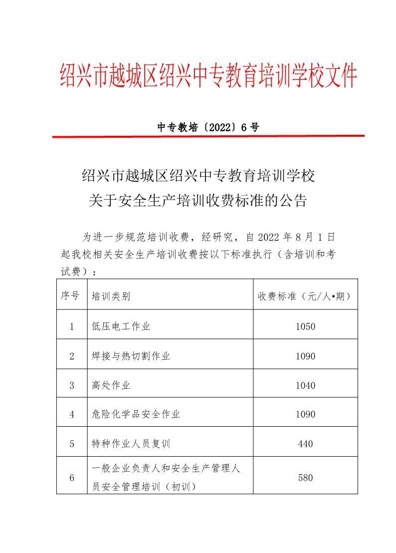 中专教培〔2022〕6号.关于安全生产培训收费标准的公告