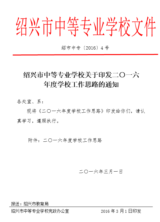 AG.COM关于印发二○一六 年度学校工作思路的通知 来源:校办公室 作者:sxzz 发布时间:2016-03-01 浏览次数: 次 【字体:小 大】 绍市中专〔2016〕4号-AG.COM2016年度工作思路.docx