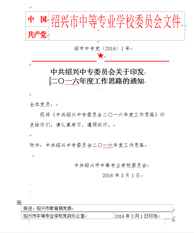 中共绍兴中专委员会关于印发二○一六年度工作思路的通知