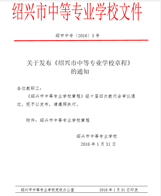 第六十四条 章程的制定需经学校教职工代表大会审议通过,学校校务会议审定,校长签发,并报绍兴市教育局核准之日起实施。