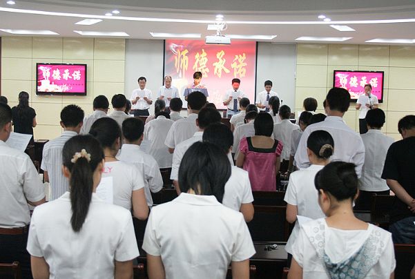 全体教师在爱岗敬业、关爱学生、教书育人、为人师表、终身学习六个方面作出承诺。忠诚党的教育事业、恪守教师职业道德规范。用智慧点燃智慧,用人格引领人格,用意志激励意志,用真情传递真情。尊重个性,关爱学生,传承文明,启智求真,严谨治学,勇于创新,团结和谐,与时俱进,为共创中专美好未来,为职教事业发展奉献一生。