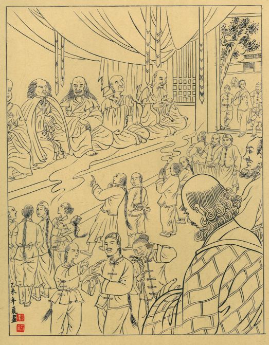 插图是运用图像表现的形式,本着审美与实用相统一的原则,尽量使线条、形态清晰明快,绘制较方便,文学插图可以说是文艺性插图的典型,包括了“题头、尾饰、单页”插图和文间插图等。其表现形式多种多样,有水墨画、白描、素描等。有了这些插图,读者不仅更直观地了解了文学形象,而且也有利于读者对文学读本的中心思想作深入理解,从中悟出做人的真谛。从1996年起,陈蔚南老师应时任文联主席朱元贵同志、副主席龚桂明先生之邀,陆续为市文联主编的风俗系列书籍绘制插图,如《绍兴百珍图赞》、《绍兴百镇图赞》、《绍兴百俗图赞》等,每本书都在20幅左右,当时在绍兴文艺界产生了较大影响。后来应市社科院李永鑫院长、周幼涛老师之邀,陈老师又为《绍兴名士》、《绍兴典故》等画了大量的插图,自此陈老师的插图艺术被视为继绍报美编王巨贤后又一奇葩。