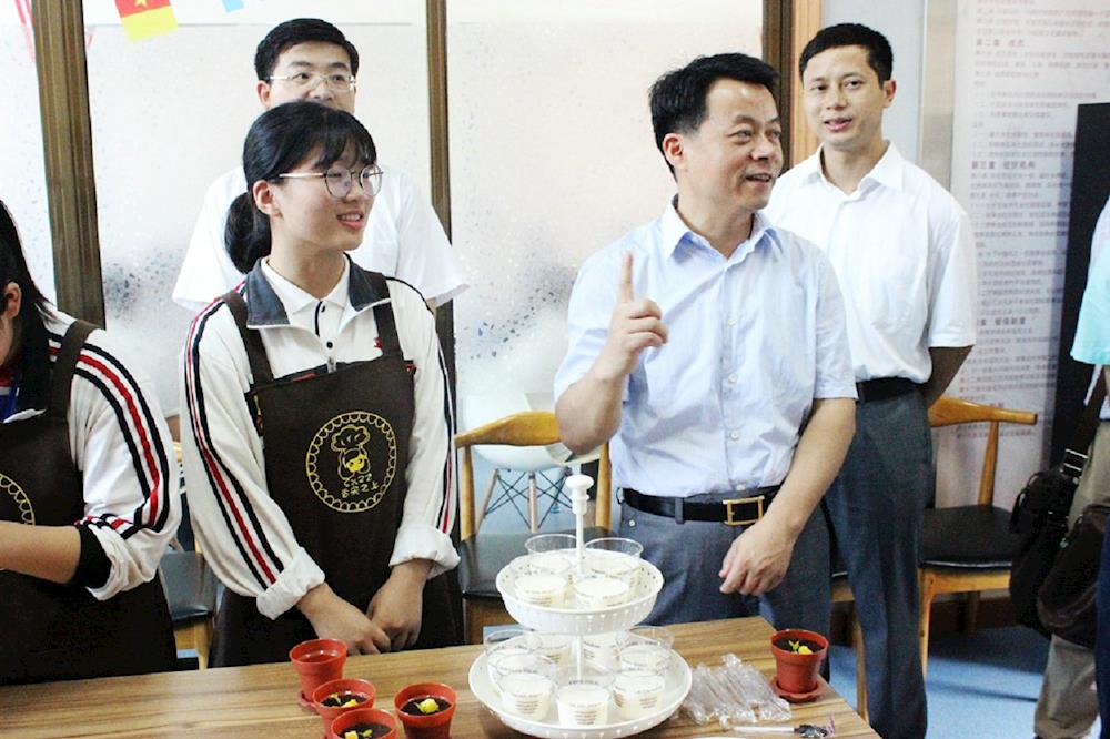 紧接着傅书记又参观了黄酒陈列馆、陶艺吧和黄酒DOS生产线等专业社团和实训基地。在黄酒陈列馆傅书记倾听了学校黄酒业人才孵化园的建设情况和绍兴黄酒的历史,品尝了同学们亲手酿造的黄酒,观看了同学们为酒坛彩绘雕花;在陶艺吧他对同学们亲手制作的陶艺作品赞赏有加;在黄酒DOS生产线他近距离了解了绍兴黄酒手工酿造和机械化生产的两种工艺流程。在手工酿造的现场,傅书记还详细询问了同学们技能学习情况。最后,他鼓励同学们要培养兴趣、苦练技能、积极进取、开拓创新、学好技能、服务社会,让自己的青春在时代进步中焕发出绚丽的光彩。