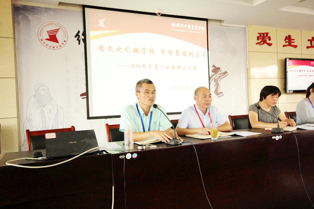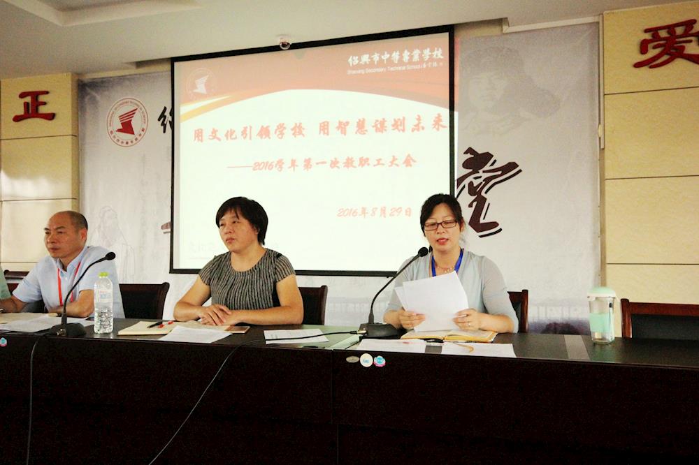 8月29日,绍兴中专隆重召开了2016学年第一学期的全校教职工大会,开启了新学期的新征程。2016年既是绍兴中专“十三五”规划建设的开局之年,又是学校实施“质量强校、文化兴校、特色亮校”战略,打造浙江省名校的关键之年。因此,此次大会既是学校“十三五”规划扬帆起航的誓师大会,又是打造浙江省名校战略启动的动员大会,对学校未来的发展具有非常重要的意义,注定在学校的校史上留下浓墨重彩的一笔。本次会议由校党委书记王慧莉主持,校长邵国成、副校长顾益明、於芳等校领导出席了本次大会,并作了重要讲话。
