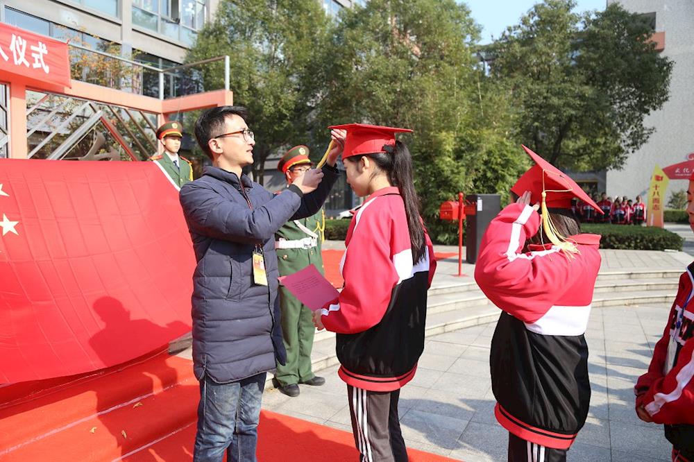 最后在国旗队学生的护送下,参会学生在庄严的国旗下郑重承诺,穿过象征责任与担当的成人门,冠以成长与勇敢的成人帽,共同唱响同一首《五月的花海》。