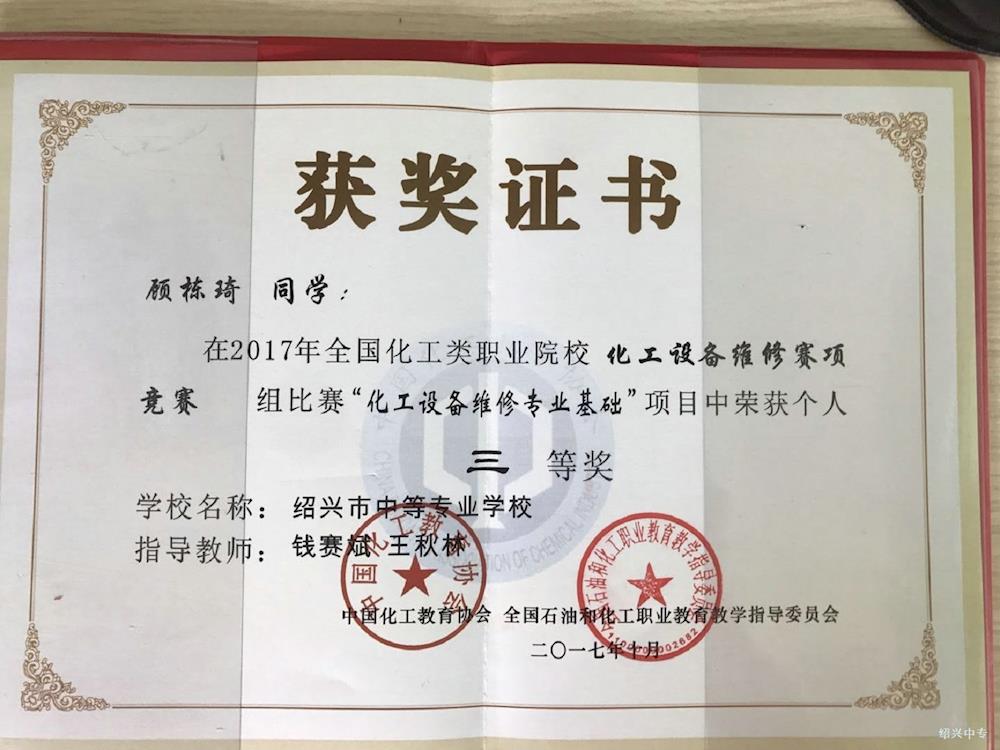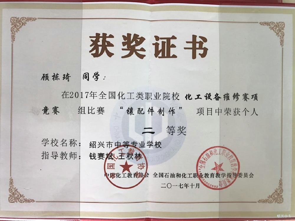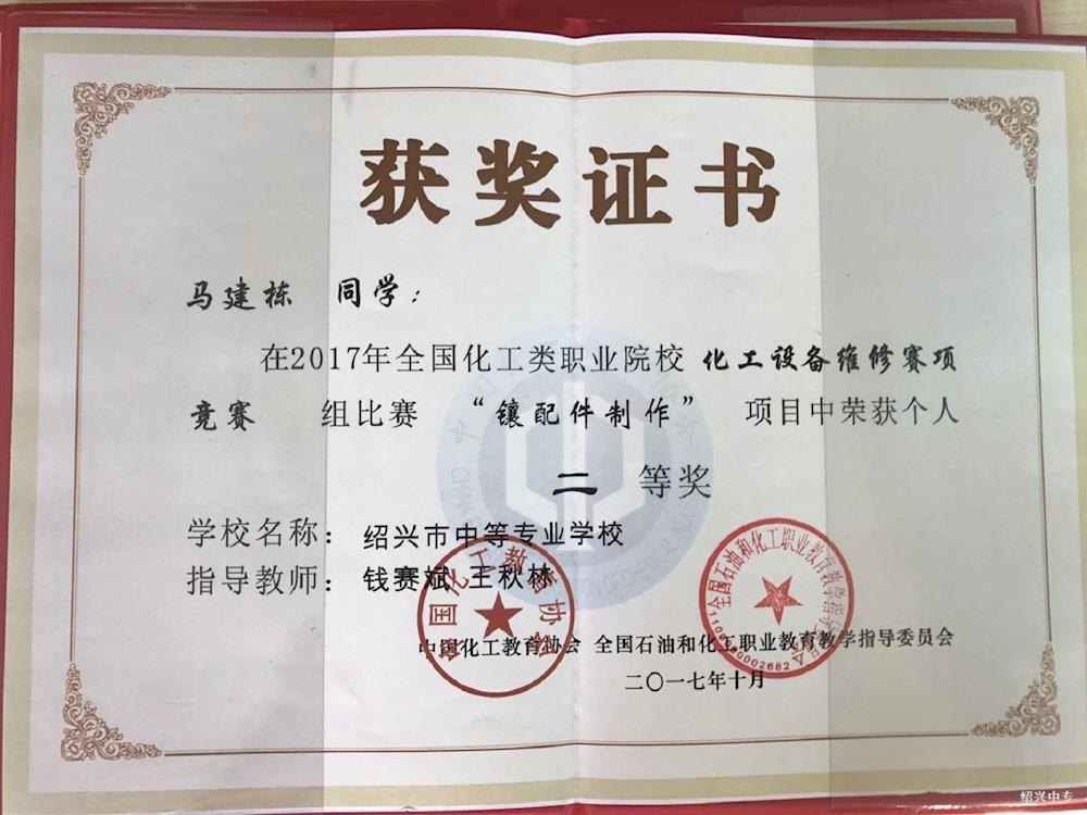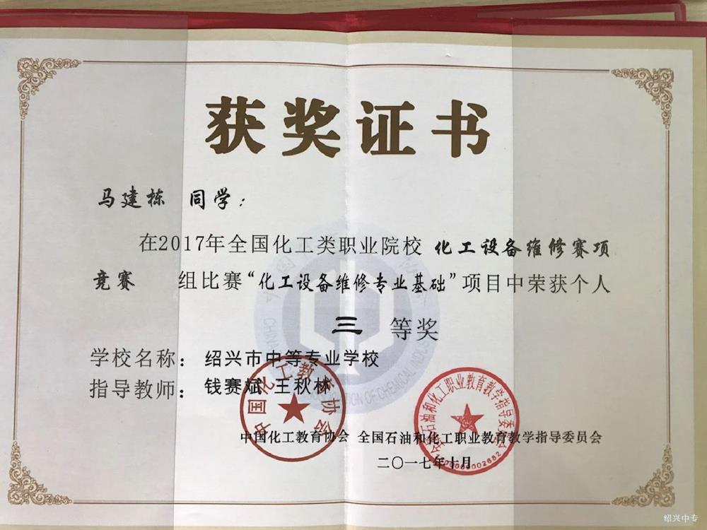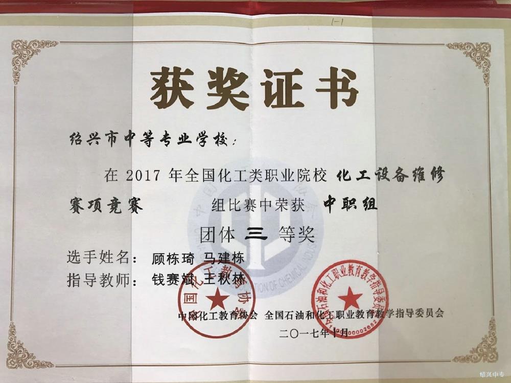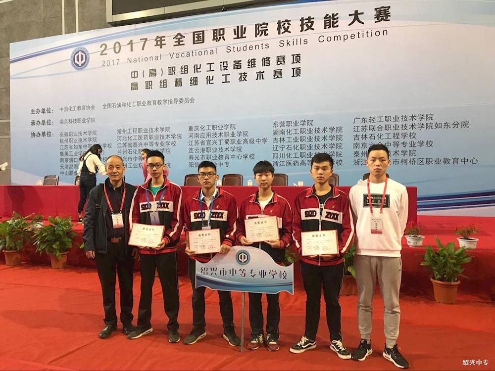 10 月25日,江苏南京“2017年全国化工类职业院校化工设备维修赛项竞赛”赛场传来喜讯,由杭建卫老师领队, 王秋林、钱赛斌老师指导,顾栋琦、马建栋参赛的 绍兴中专代表队在此次竞赛中摘得五个奖项, 顾栋琦、马建栋都获得“镶配件制作”项目与“化工设备维修专业基础”项目个人二等奖与三等奖,AG.COM取得中职组团体三等奖。