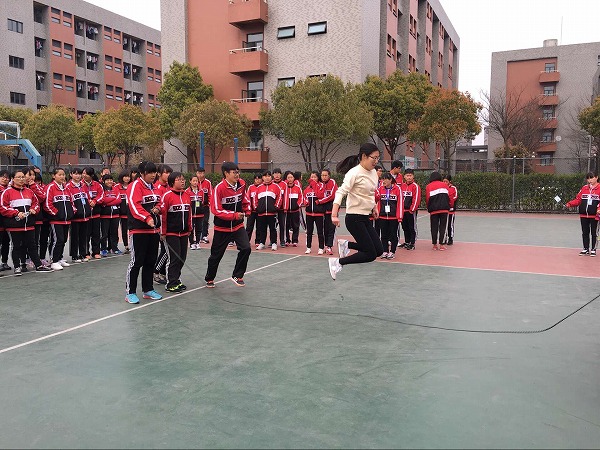 通知一出,各个班级便积极活动起来。首先是邀请老师,系部中的年轻教师和体育方面比较突出的教师成了“抢手货”,几个班级同时发出邀约。其次,自己班级同学也必须挑选出精兵强将。最后则是比赛前的训练。比赛前一周的中午或者活动课时间,校园各个角落都能看到一个老师带着一群学生,在练习跳长绳。